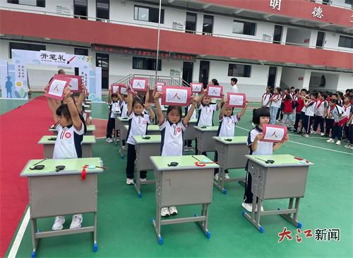 随后进行的一年级开笔礼充满中华优秀传统文化韵味。新生在师长牵引下穿过“启智门”,依次完成正衣冠、朱砂启智、击鼓明志、启蒙描红等仪式。学生额点朱砂,击鼓明志,学写“人”字,在古典礼仪中感悟勤学修身之道。