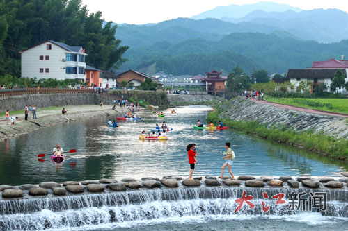 游客在靖安县中源乡三坪村戏水。江西日报全媒体记者 洪子波 摄
