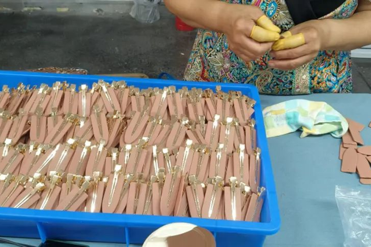 加工点老板介绍道:“我们与义乌那边有长期合作,货源稳定,只要好好干,一个月挣千把块不成问题。这活儿简单,上手快,欢迎大家来试试。”54岁的村民何淑兰挤在人群前排,手里拿着一个刚做好的发卡端详着。 她拿起金属发夹往发卡底座上粘,手法还挺熟练,旁边几位大妈纷纷拿起桌上的材料试做起来,你一言我一语地讨论着怎么粘更结实。