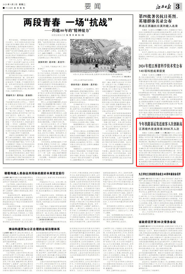 今年暑运期间,南铁动态实施“一日一图”,累计加开旅客列车4481列,其中动车组列车4204列,保障旅客暑期出行需求。得益于暑运列车运行的加密,杭昌高铁等线路运力进一步扩充,部分前往热门景点方向的列车实现公交化开行。其中,南昌至景德镇方向最短运行时间压缩至42分钟,日均开行列车达47列,景德镇北站今年暑期发送旅客160.39万人次,同比增长29.97%。此外,为承接赣超热度,南铁对球迷流向进行数据画像,按照满足“观赛+旅游”的复合需求,开行庐山至鹰潭、庐山至上饶、南昌至九江3对球迷定制专列,累计发送旅客6656人次。