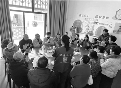 与此同时,在社区“爸妈食堂”里,温情满满的银龄生日会热闹举行(下图)。伴随着欢快的生日歌,老人们围坐在一起许愿、吹蜡烛,志愿者与他们拉家常,现场其乐融融。“在社区过生日比在家里更热闹,太温暖了!”年过八旬的田奶奶道出了老人们的心声。