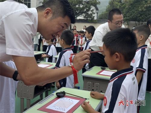 随后进行的一年级开笔礼充满中华优秀传统文化韵味。新生在师长牵引下穿过“启智门”,依次完成正衣冠、朱砂启智、击鼓明志、启蒙描红等仪式。学生额点朱砂,击鼓明志,学写“人”字,在古典礼仪中感悟勤学修身之道。